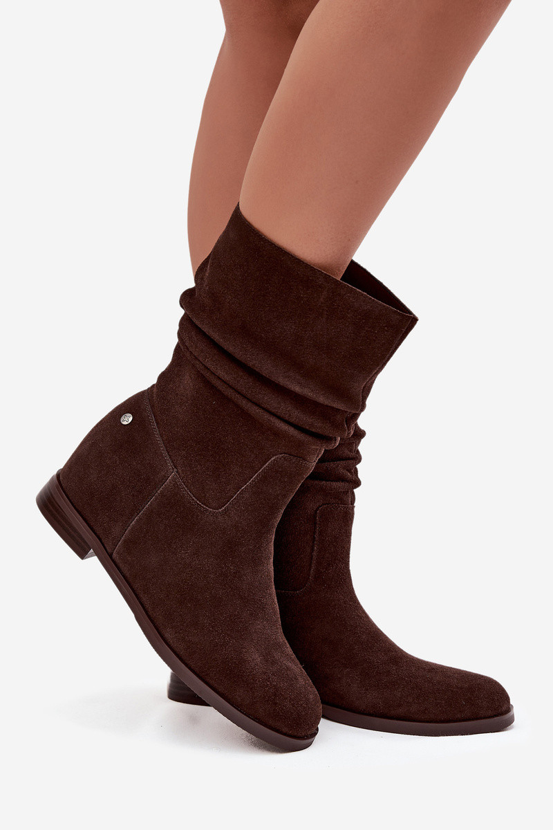 Šokoladiniai odiniai zomšiniai moteriški batai su raukiniais, pašiltinti Tai turiciejka K7211-02