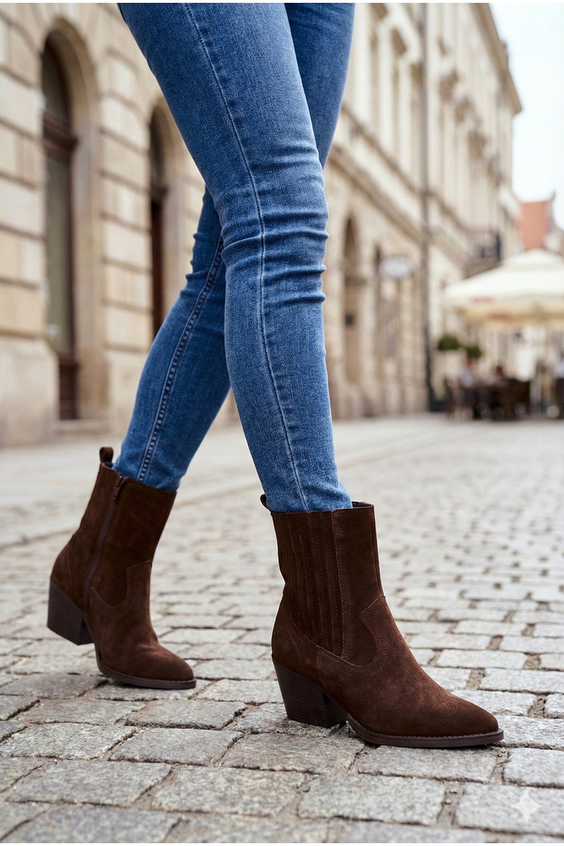 Šokoladinės spalvos zomšiniai kaubojiško stiliaus moteriški batai su kulniukais, šiltinti Dylira